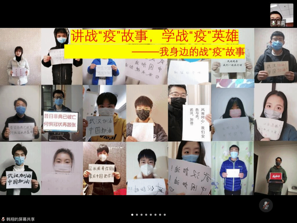 随后韩翔老师分享了物材学院2019级同学的战“疫”故事,李洲同学在除夕夜为疫情防控值班,让他有了不一样的新年,也有了不一样的收获和感悟。李哲同学在家乡成为一名志愿者,做好每一个细节,帮助居民减少风险。张紫荆同学在疫情期间作为志愿者学会与他人交流,学会关爱他人,并更深刻的领会到生命的意义。张沧同学在国家最需要的时候站出来为尽绵薄之力,感受到了基层的温暖。