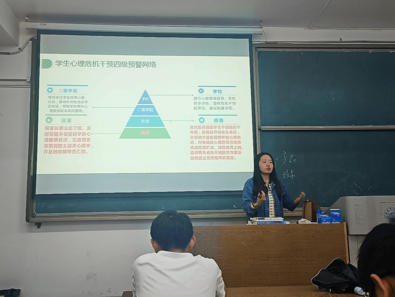 为进一步完善学院心理危机早期预警机制,发挥寝室长在“学校——院系——班级——宿会”四级预警网络中的重要作用,做到对学生心理危机干预“早发现、早报告、早干预”,4月24日-25日,永利集团304am登录分别在锦绣、滨湖校区开展寝室长心理危机干预专题培训。辅导员、心理健康教育中心张玲俐老师进行授课,各年级全体寝室长、心理委员参加培训,培训会由辅导员韩翔主持。