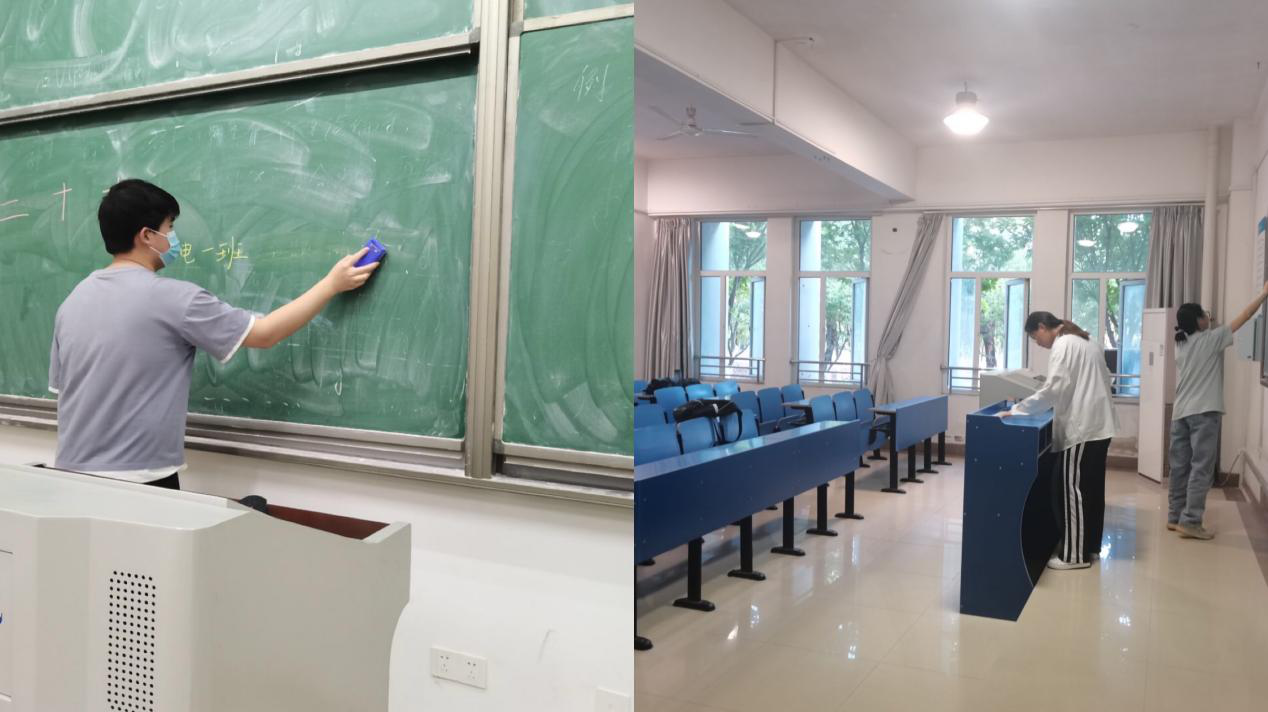 教室劳动中,同学们将教室内杂物垃圾清理的干干净净,认认真真擦净讲台、黑板,努力为同学们上课学习营造良好环境。