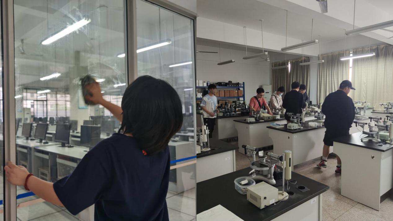实验室劳动中,同学们一丝不苟的清扫并整理实验仪器,了解实验室安全、专业设备等相关知识,爱护公共资源。