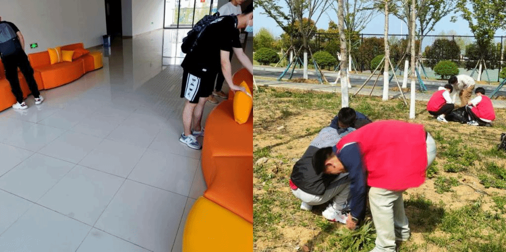 校园劳动中,同学们在老师的带领下,除杂草,拾枯叶,搬碎石,维护草坪生态环境,在烈日之下挥洒汗水,摆列打扫公共区域,一人一岗,定期执勤。