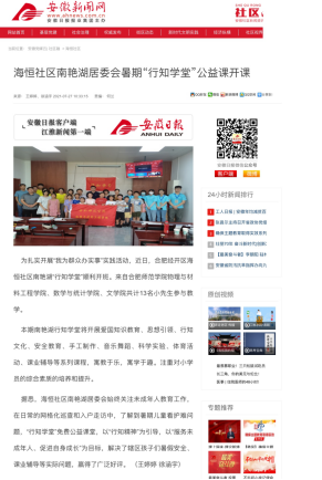 7月9日,永利集团304am登录海恒社区南艳湖“行知学堂”顺利开班,来自永利集团304am登录、数学与统计学院、文学院共计13名小先生参与教学。据悉该行知学堂已连续开班三年,本期学堂将开展思想引领、行知文化、安全教育、科学实验等系列课程,寓教于乐,寓学于趣,注重对小学员综合素质的培养和提升。