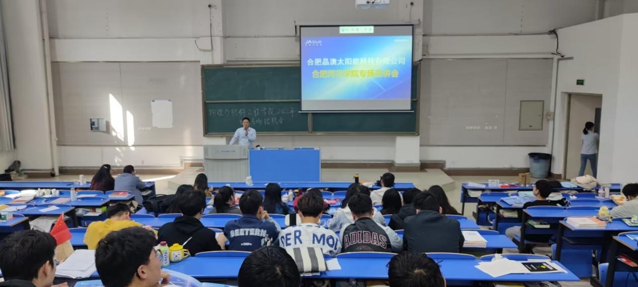 合肥晶澳太阳能科技有限公司人事经理许学铭通过视频和PPT向同学们展示了公司的企业文化、职业发展方向、人员需求以及选择该公司的理由,并现场解答了同学们的疑惑。
