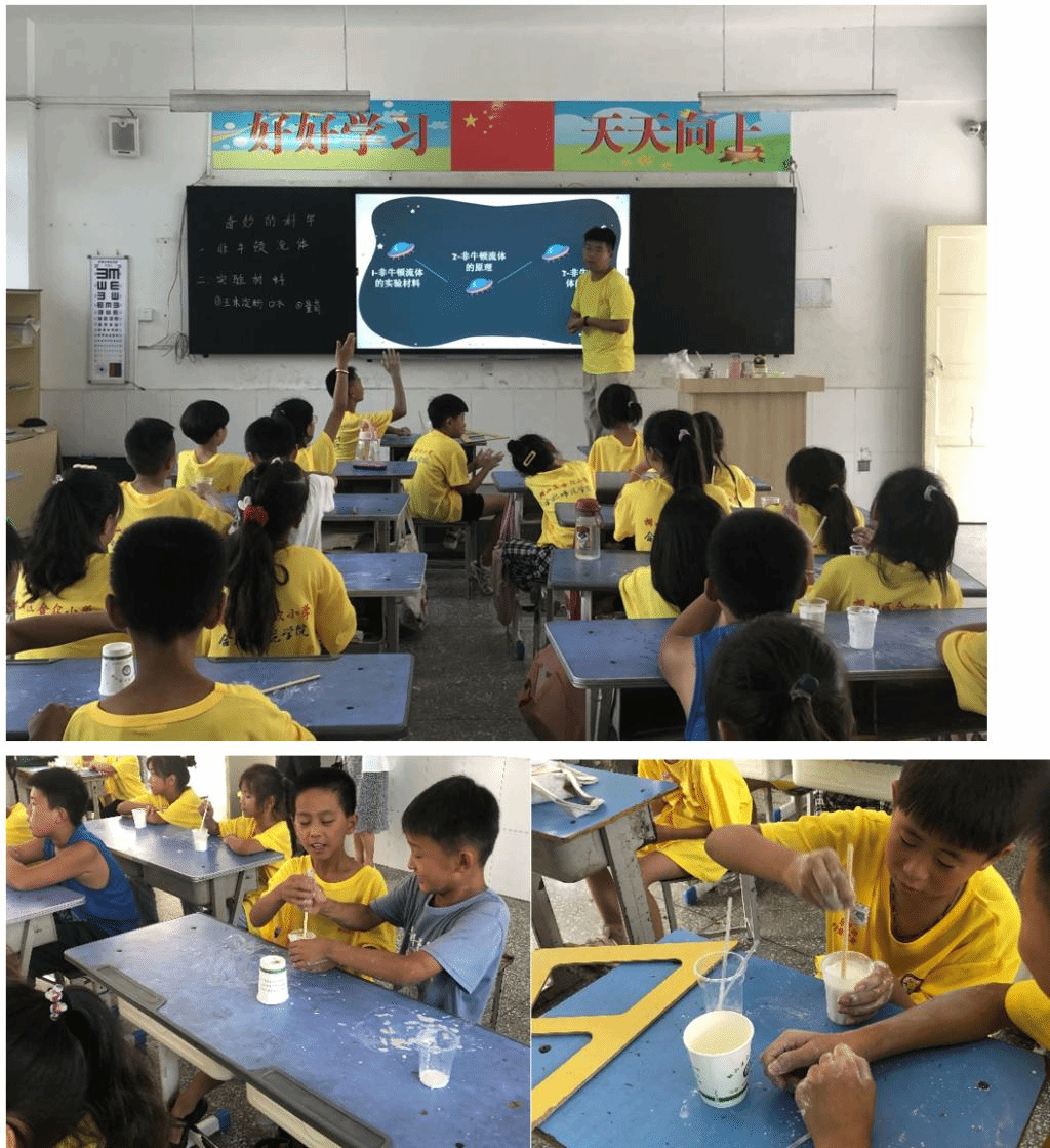结业仪式以一节特别的“科普课”拉开帷幕。物材学院“格物思维”科普服务队的志愿者和“冠星游”学堂的“小先生”们通过耐心讲解,现场演示,带领小学员亲自动手制作“特殊材料”,逐步引导小学员们认识非牛顿流体物质,小学员们被神奇的物理现象深深吸引,课堂积极踊跃,气氛热烈。
