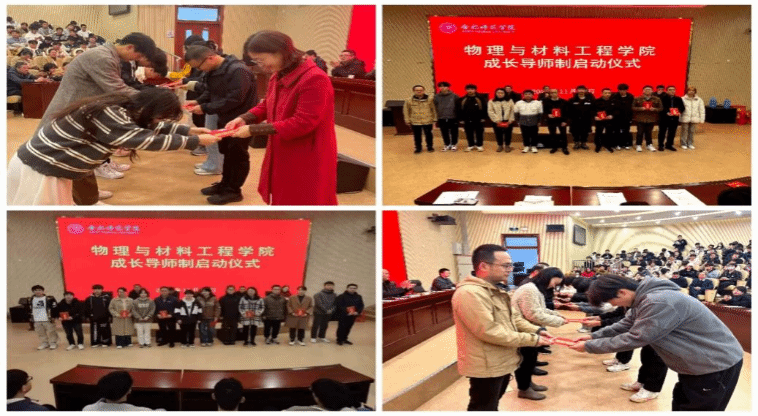 光电信息科学与工程系主任蒋杉、新能源材料与器件系主任马小航、物理学系主任李冬鹏、材料科学与工程系主任王琳分别宣读各专业导师名单及对应指导学生名单。随后各专业老师分组上台,接受学生代表诵读拜师词、呈送拜师帖、行拜师礼。
