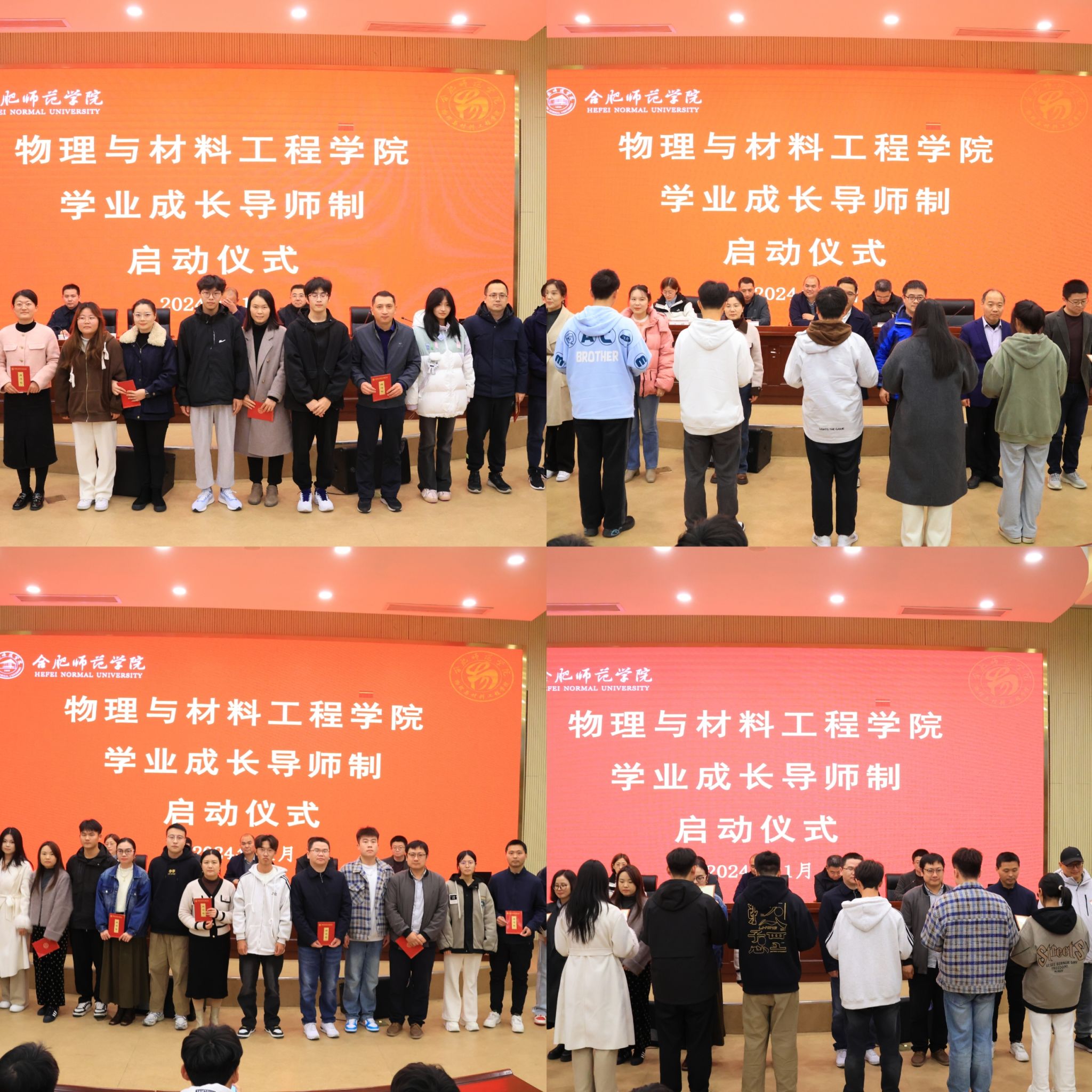 光电信息科学与工程系主任蒋杉、新能源材料与器件系主任马小航、物理学系主任沈永才、材料科学与工程系主任王琳分别宣读各专业导师名单及对应指导学生名单。随后各专业老师分组上台,接受学生代表诵读拜师词、呈送拜师帖、行拜师礼。