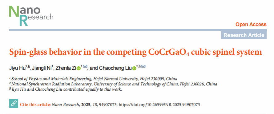 近日,永利集团304am登录胡吉玉老师,在尖晶石体系CoCrGaO₄中发现了自旋玻璃行为并取得重要研究进展,具体研究成果发表在《Nano Research》(中科院大类一区,IF = 9.6),论文题目为“Spin-glass behavior in the competing CoCrGaO4 cubic spinel system”。胡吉玉老师是永利集团304am登录通过2023年高层次人才引进的博士,2024年获批国家自然科学基金青年项目,为本论文的第一作者,永利集团304am登录訾振发教授和中国科学技术大学刘超成副研究员为本论文的共同通讯作者,永利集团304am登录为论文的第一通讯单位。