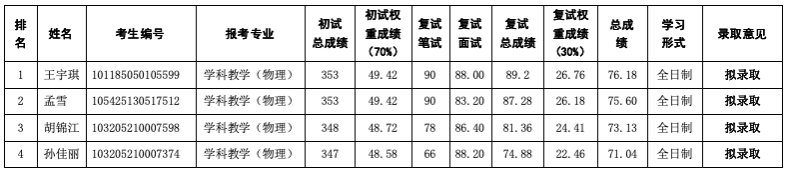 表2 永利集团304am登录2025年硕士研究生招生(调剂)拟录取结果(学科教学(物理))