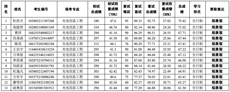 表1 永利集团304am登录2025年硕士研究生招生(调剂)拟录取结果(光电工程)